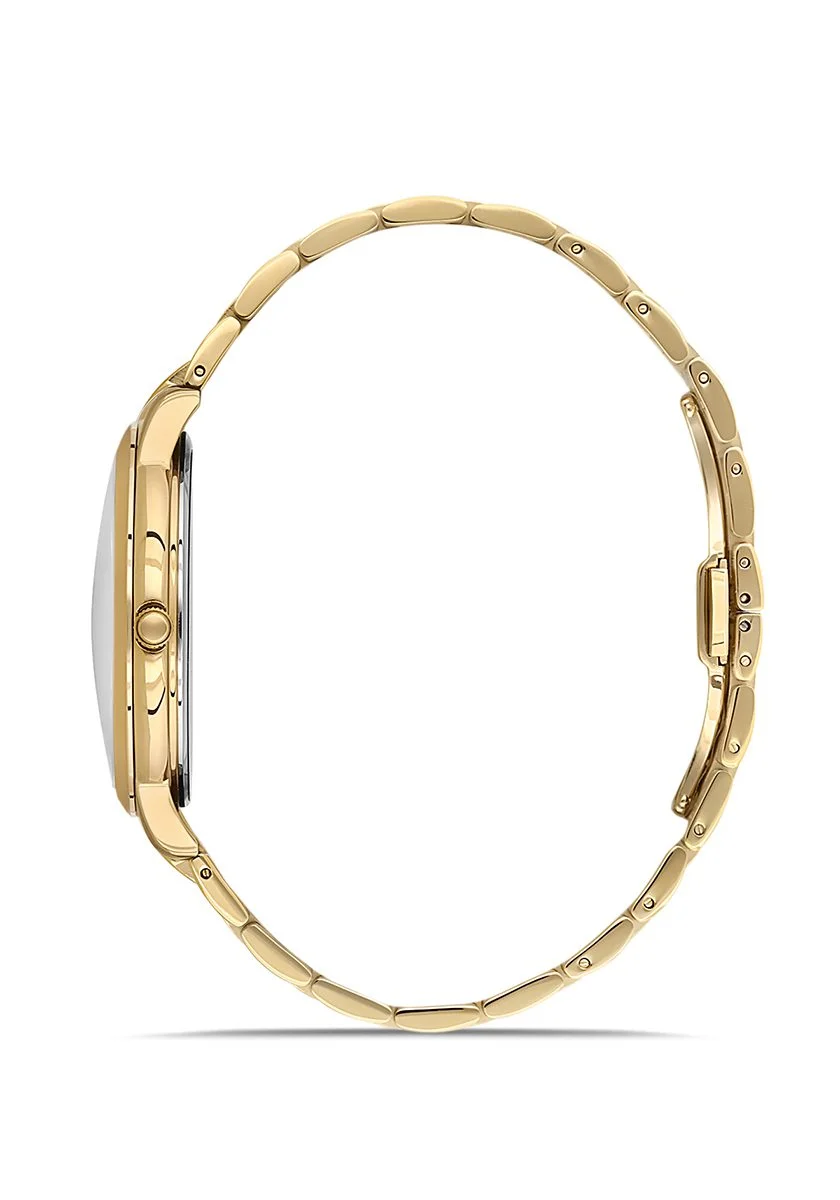 Gümüş ve altın tonlarının zarif uyumu, paslanmaz çelik kordon ve kasa ile birleşerek göz alıcı bir bütünlük oluşturur. Yalın ve okunaklı kadranı, her an zamanı en şık şekilde takip etmenizi sağlar.