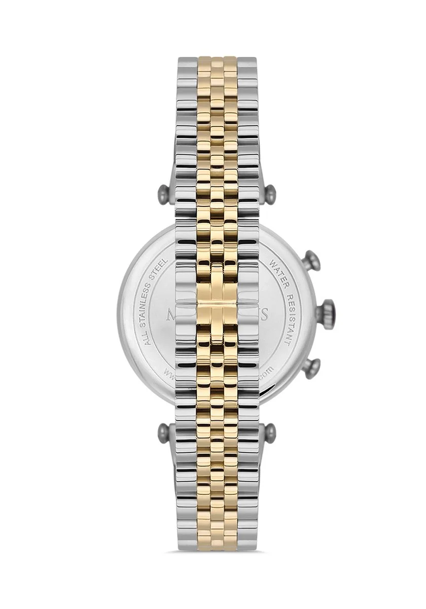Özel mıhlama tekniğiyle kasasına ve kadranına özenle yerleştirilmiş parlak taşlar, ışığın her açısında göz alıcı bir parlaklık sunar. Gümüş ve altın tonlarının uyumlu dansı, bu saati hem günlük kombinlerinizle hem de özel davetlerdeki şıklığınızla kusursuz bir şekilde bütünleştirir.
